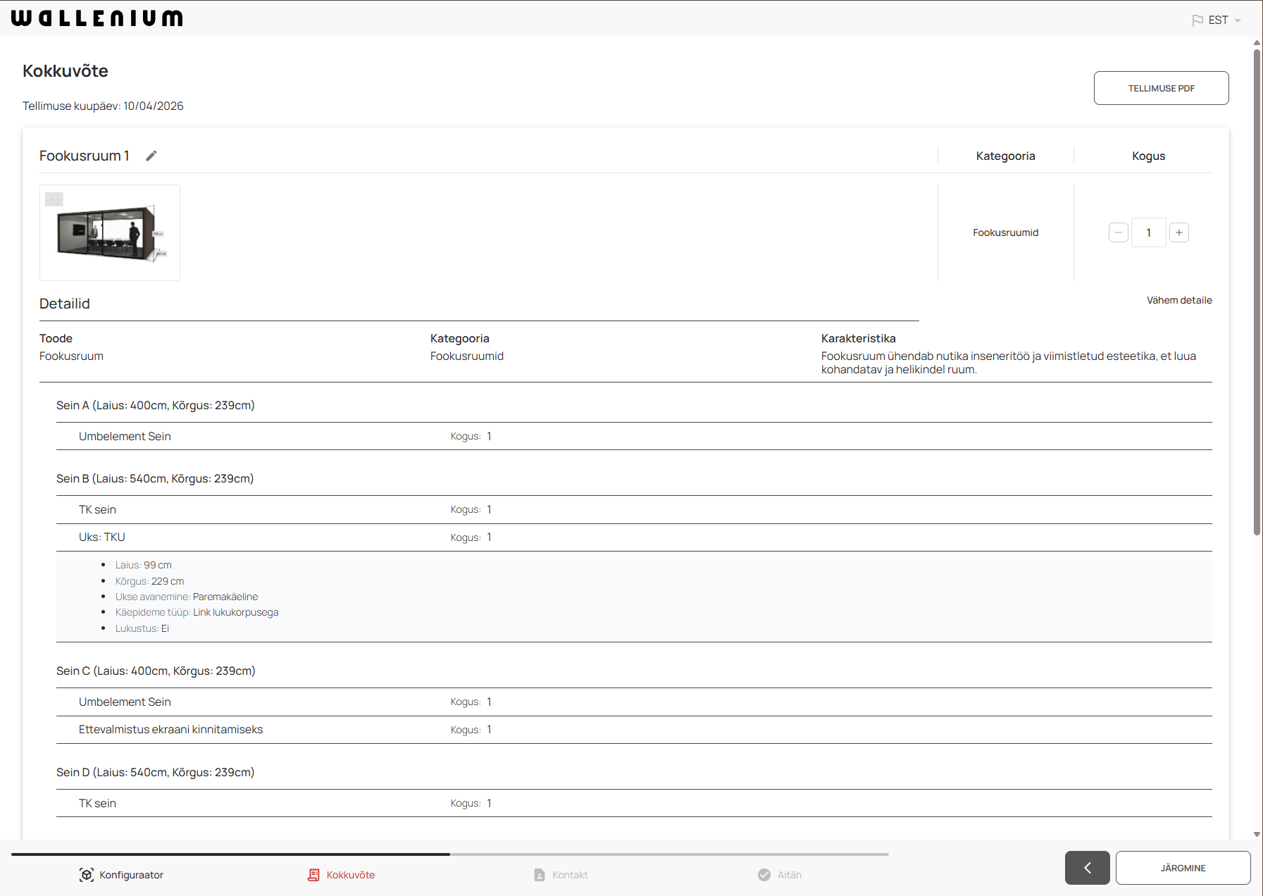 An interactive web-based 3D configurator that allows Wallenium's sales teams and clients to design custom-made focus rooms in real time — adjusting dimensions, doors, wall finishes, interior materials, and extras — and instantly generate a detailed order PDF with multi-angle 3D snapshots.